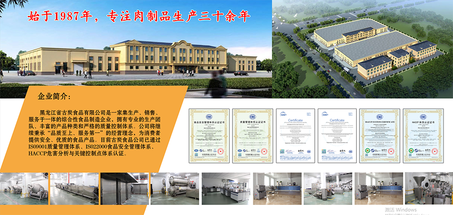 黑龙江省古炭食品有限公司,始建于1987年专注从事肉制品行业30余年。坐落于有森林氧吧之称的牡丹江市,森林覆盖率高达68%自然环境得天独厚。公司于2018年在牡丹江江南开发区,建成近万余平米现代化生产车间,生产设备精良,污水处理、锅炉大气污染排放等均符合国家环保要求的新厂区。现日均生产能力可达50-100吨,聘请国内专业肉制品管理团队实现6S标准化生产,公司秉承“产品质量无小事,食品安全大如天”的质量理念,铁腕抓质量,铁心保安全。本企业已通过IS09001、IS022000、HACCP管理体系认证。我们的目标是在不同的产品领域,在不同的地区,作为厂商为广大的顾客提供更高品质的产品和服务。